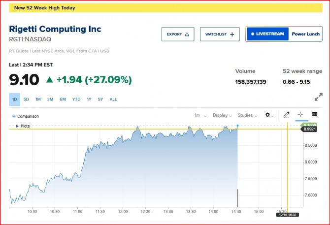뉴욕증시 양자컴퓨팅 수혜주 리게티 주가/ CNBC