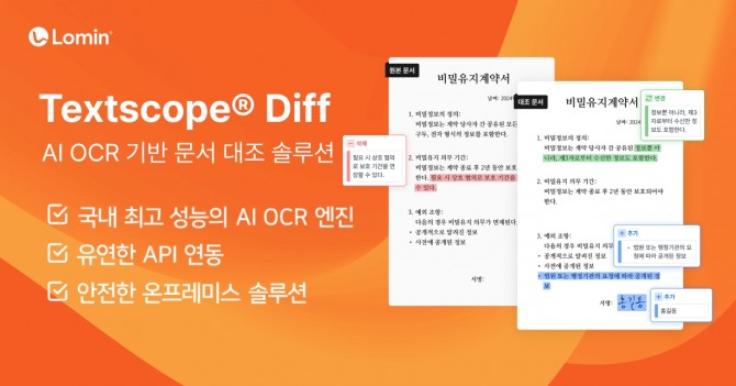 이미지 확대보기텍스트스코프® Diff는 문서 간 차이를 자동으로 비교해 삭제, 추가, 변경된 내용을 검출하고 이를 시각적으로 표시해주는 AI 기반 솔루션이다. 고성능 AI OCR(광학 문자 인식) 기술을 통해 스캔 문서나 이미지에서도 텍스트를 정확히 추출하며, PDF, PNG, TIF, JPG 등 다양한 파일 형식을 지원해 기존의 단순 텍스트 대조 솔루션과 차별화된 정확성과 범용성을 갖췄다.