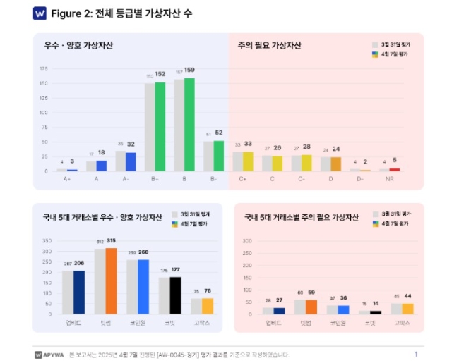 지난 7일 가상자산 데이터 분석 업체 애피와(APYWA)가 발표한 '가상자산 평가 분석 보고서'에 따르면, 2025년 3월 31일부터 4월 7일까지의 데이터를 기준으로 국내 5대 거래소(업비트, 빗썸, 코인원, 코빗, 고팍스)에 상장된 전체 가상자산은 총 534개였다. 이 중 평가가 완료된 가상자산의 평균 평가점수는 65점이며, 평균 등급은 B등급으로 집계됐다.