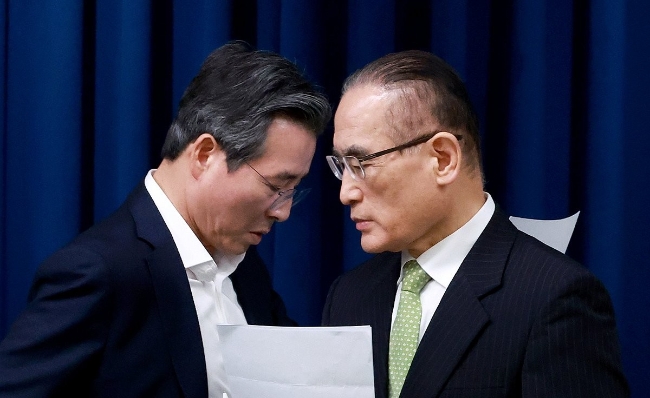 한미 간 통상 갈등 해소를 위한 막판 조율에 속도가 붙고 있다. 사진은 (왼쪽부터) 김용범 대통령실 정책실장과 위성락 국가안보실장이 지난 25일 통상대책회의 관련 브리핑에서 자리를 옮기는 모습=연합뉴스