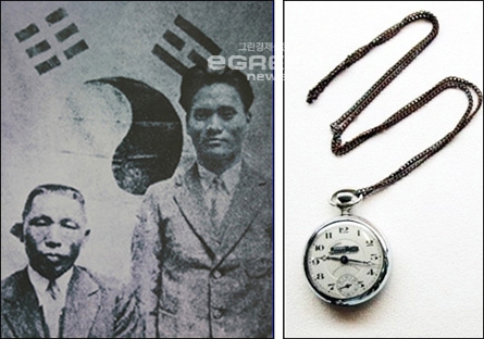 ▲의거전한인애국단장김구선생과함께(왼쪽),이때김구선생에게건너준윤봉길시계(보물제568-3호)이미지 확대보기