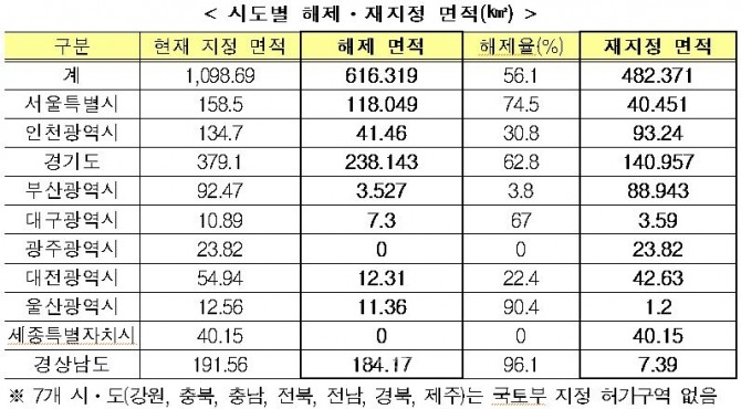 이번에 해제되는 지역은 국토부 지정 토지거래허가구역(1,098.69㎢)의 56.1%에 해당하며, 이에 따라 허가구역은 국토 면적의 1.1%에서 0.5% 수준으로 줄어들게 된다.