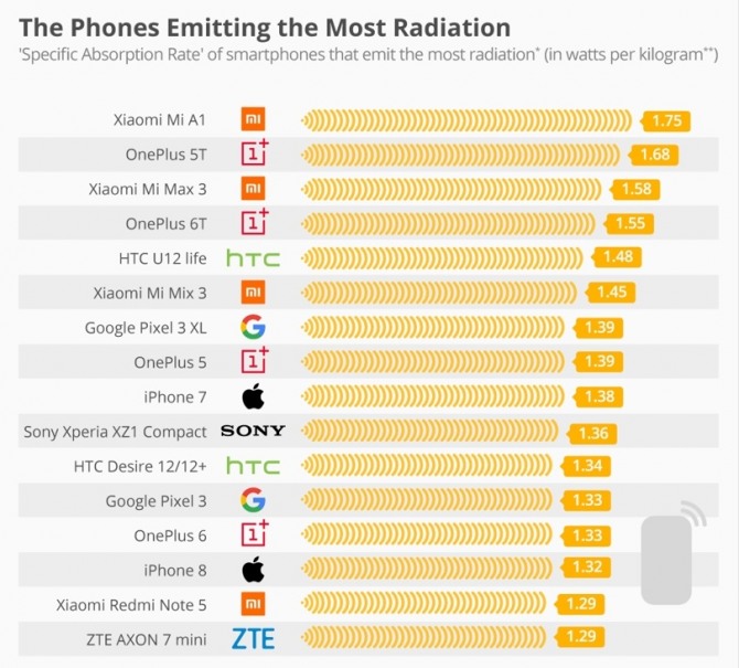 이 데이터에 따르면, 가장 높은 수준의 전자파를 방출하는 단말기는 샤오미 미 A1(Mi M1)으로서 kg당 1.75와트(W/kg)의 전자파를 방출하는 것으로 나타났다. 다음으로 전자파를 많이 방출하는 단말기는 중국 원플러스 5T로서 kg당 1.68W를 기록했다. 일부 미국 소비자들에게도 인기있는 원플러스6T의 방출량은 kg당 1.55W로 4위를 기록했다. 지난해 미국에서 가장 급속히 성장한 구글 픽셀3XL은 kg당 1.39W로 7위를, 픽셀3는 kg당 1.33W로 12위를 기록했다. 애플 아이폰7은 1.38W로 9위, 아이폰8은 1.32W로 14위를 각각 기록했다.