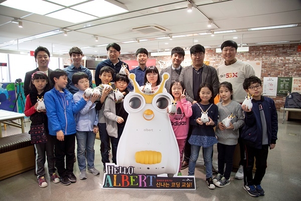 SK텔레콤과 초등컴퓨팅교사협회가 함께 준비해온 ‘신나는 코딩 교실’도 SK텔레콤 일산 지점에서 13일 첫 수업을 시작했다. 이날 ‘알버트 로봇’을 이용한 소프트웨어 교육을 체험한 초등학생들은 명령에 따라 움직이는 ‘알버트 로봇’을 보면서 연이어 탄성을 질렀으며, 교육장 분위기는 뜨겁게 달아 올랐다.