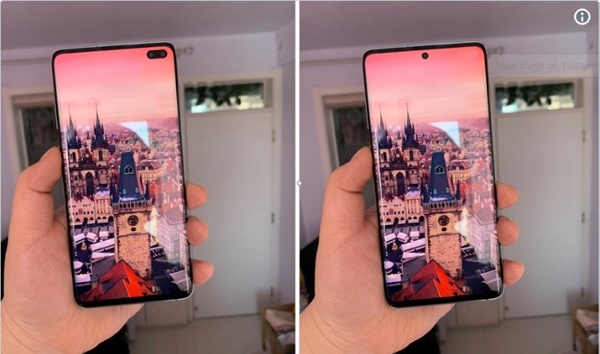 이미지 확대보기오른쪽에 있는 단말기는 곡면 인피니티-O 디스플레이가 탑재된 갤럭시S10플러스폰이다. 듀얼렌즈 구멍 펀치 카메라는 오른쪽 상단에 위치한다. 오른쪽 갤럭시노트10 단말기는 포토샵으로 작업한 것이다. 갤럭시S10플러스는 듀얼 렌즈 셀카를 숨기고 싱글 렌즈 전면 카메라를 화면 중앙에 배치해 노트10으로 변신했다.