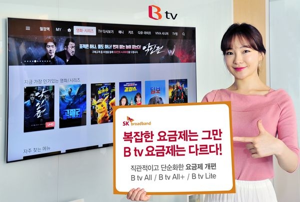 이미지 확대보기SK브로드밴드는 1일 ‘비 티비 올(B tv All)’, ‘비 티비 올 플러스(B tv All+)’ ‘비 티비 라이트(B tv Lite)’ 등 3개 요금제를 큰틀로 삼아 단순화한 새로운 요금제를 출시했다고 밝혔다.
