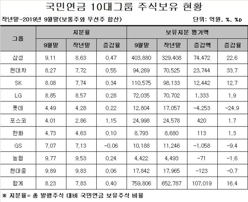 국민연금이 보유하고 있는 10대그룹 상장기업의 주식가치는 65조2787억 원에서 75조9806억 원으로 10조7019억 원, 16.4% 증가했다.