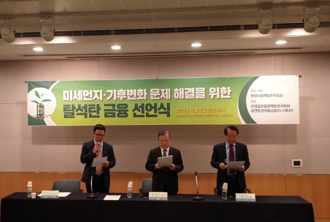 이미지 확대보기한국사회책임투자포럼은 3일 ‘미세먼지·기후변화 문제 해결을 위한 탈석탄 금융선언식’에서 DB손보·교직원공제회·행정공제회가 탈석탄금융을 선언했다고 밝혔다.
