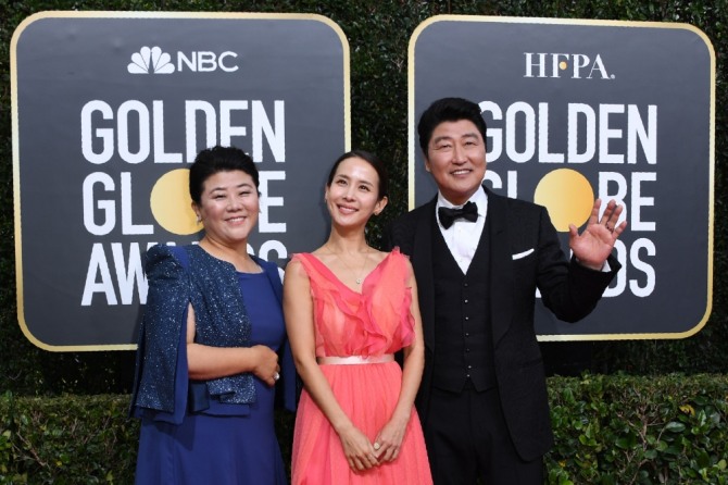 영화 '기생충' 출연진 이정은(왼쪽부터), 조여정, 송강호가 5일(현지시간) 미국 캘리포니아 주 베벌리힐스의 베벌리힐튼호텔에서 열린 77회 연례 골든글로브 시상식에 참석해 있다.사진=연합뉴스