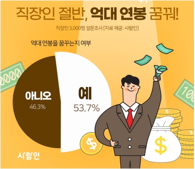 9일 구인구직 매칭 플랫폼 사람인이 직장인 3000명을 대상으로 ‘1억 원대 이상 연봉을 꿈꾸는지 여부’를 조사한 결과, 53.7%가 ‘그렇다’고 밝혔다.