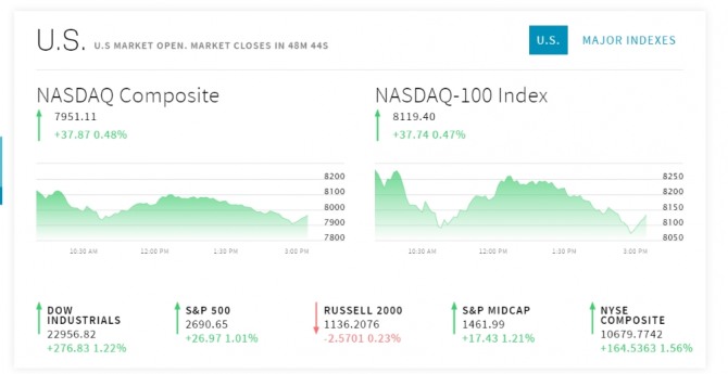 다우지수 DOW INDUSTRIALS 22956.82 +276.83 1.22%