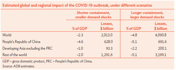 아시아 지역의 경제성장률은 미중 무역갈등, 전자제품 시장 침체, 투자 감소로 2018년 5.8%에서 2019년 5.2%로 낮아졌다. 2019년 말 미·중 1단계 무역합의 및 전자제품 시장 회복세로 아시아 경제는 기존 성장세로 복귀할 것으로 보였으나 코로나19 대유행으로 이러한 기대감은 사라졌다. 올해 ADB의 보고서에 따르면 코로나19 대유행으로 인한 불확실성이 있긴 하나 올해 아시아 지역 성장률은 2.2%를 기록할 것으로 전망했으며, 2021년에는 6.2%로 경제성장을 회복할 것이라고 했다. 한편 ADB는 생필품 공급 및 국제송금 애로, 사회경제 위기, 의료 및 교육 접근불가가 격화되면 세계 GDP의 최대 4.8%까지도 영향을 줄 수 있다고 분석했다.
