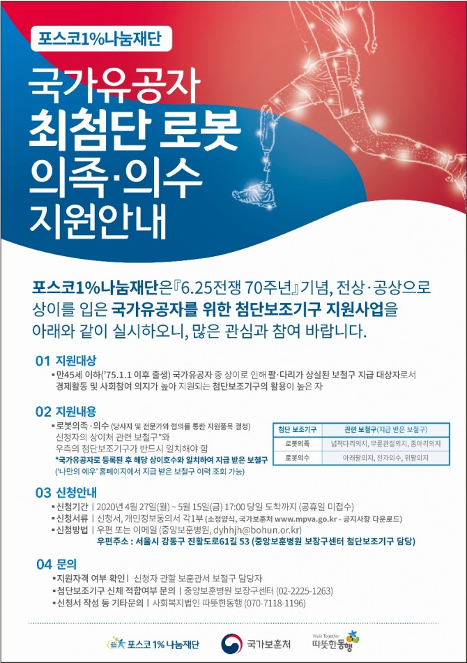 포스코1%나눔재단(이사장 최정우)이 6.25전쟁 70주년을 맞아 전상(戰傷), 공상(公傷)등으로 부상 당한 국가유공자에게 맞춤형 로봇 의족·의수를 지원하는 ‘국가유공자 첨단보조기구 지원사업’ 대상을 모집한다.
