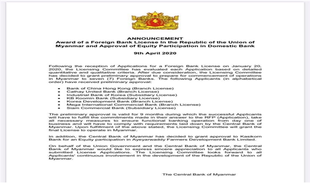 미얀마 금융산업의 문이 열린다. 산업은행과 기업은행, 국민은행이 미얀마 중앙은행(CBM, Central Bank of Myanmar)으로부터 지점 및 현지법인 설립을 위한 예비인가를 받았다. 4월 9일 미얀마 중앙은행은 이번 미얀마 은행허가 경쟁에 참여한 5개 국가 13개 은행 중 한국의 3개 은행을 비롯해 총 7개 은행에 예비인가를 승인했다.