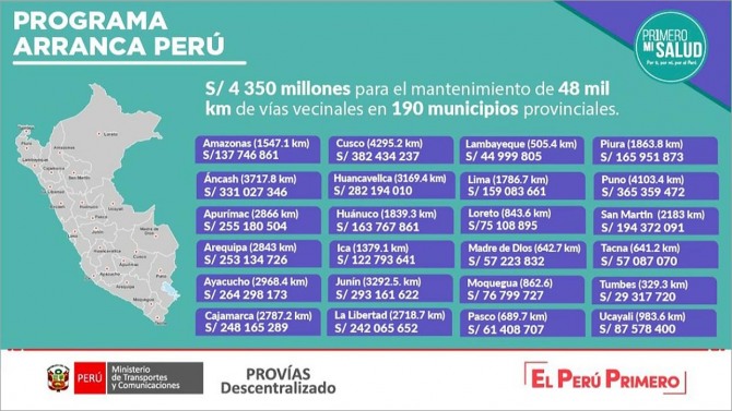 특히 교통통신부에서 진행 예정인 도로 유지보수 프로젝트는 그 큰 규모만큼 관심을 각광받고 있으며, 부처의 감독 하 190개 시정부에서 세부 사업수행이 이루어질 예정이다. Arranca Peru 지원금 혜택을 받는 도로 프로젝트 리스트는 다음과 같다.