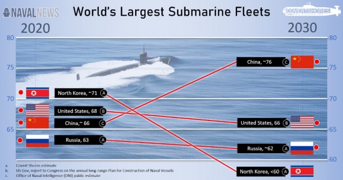 보고서에 따르면, 북한은 현재 71척의 잠수함을 보유해 잠수함 수에서는 세계 1위인데 10년 뒤에는 그 숫자가 급격히 감소할 것으로 예측됐다. 미 해군은 북한의 잠수함이 얼마나 줄어들지 정확한 숫자는 명시하지 않았다.