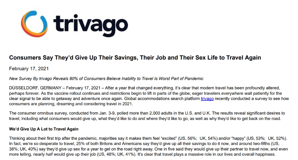 여행을 하고 싶은 욕망이 어느 정도인지를 파악하기 위해 마련된 이번 조사에 참여한 미국의 38%와 영국인의 40%는 당장 여행을 떠날수만 있다면 1년간 성생활을 포기할 용의가 있다고 답했다. 이번 조사에 참여한 미국인과 영국인 중 80%는 여행을 할 수 없는 점이 코로나19 사태로 인해 겪는 가장 불편한 점이라고 밝혔다.