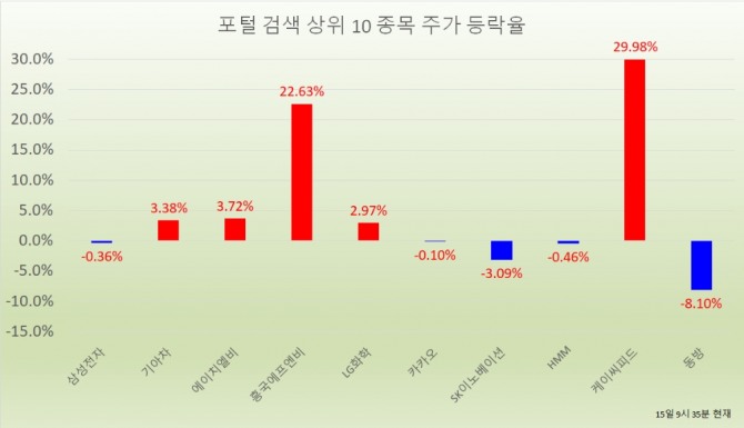 표기 순서는 포털사 기준 검색 상위 랭킹, 종목명, 현재가, 주가 등락률 순이다.