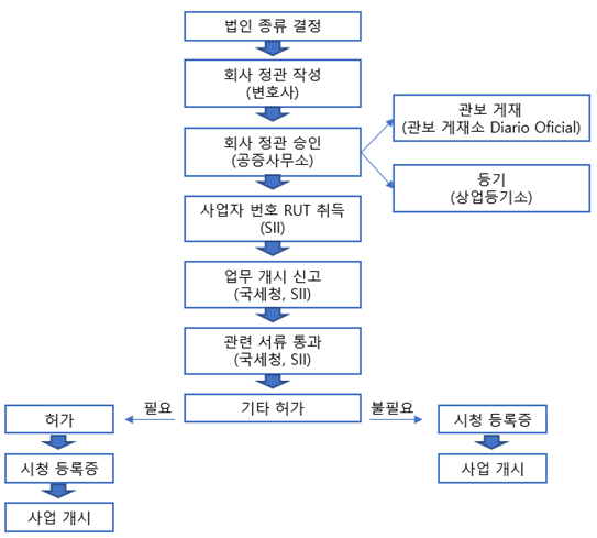 | * 폐쇄형 : 회사의 주식이 증권거래소에 등록되지 않아 거래되지 않으며, 회사 정관 서명일로부터 최대 60일 이내에 부동산 상업등기소(Comercio del Conservador de Bienes Raíces)에 사무실 주소를 등록해야 함 | ||
