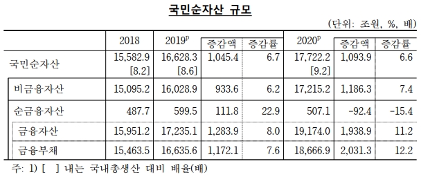 이미지 확대보기22일 한국은행과 통계청이 발표한 2020년 국민대차대조표(잠정)에 따르면 2020년말 현재 우리나라의 비금융자산과 순금융자산을 합한 국민순자산은 전년에 비해 1093조9000억 원 증가한 1경7722조2000억 원으로 잠정 집계됐다. 이는 국내총생산 의 9.2배 규모다.