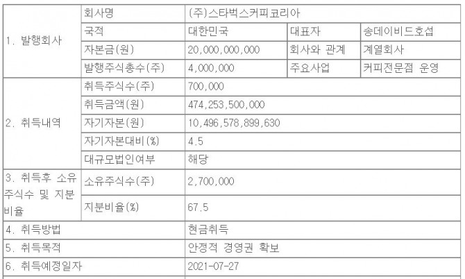 신세계그룹이 27일 스타벅스 코리아의 지분을 17.5% 추가로 인수한다고 공시했다. 표=금융감독원 전자공시시스템이미지 확대보기