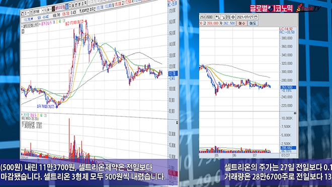 셀트리온헬스케어는 전일보다 0.44%(500원) 내린 11만3700원, 셀트리온제약은 전일보다 0.34%(500원) 하락한 14만5200원에 마감됐습니다. 셀트리온 3형제 모두 500원씩 내렸습니다.