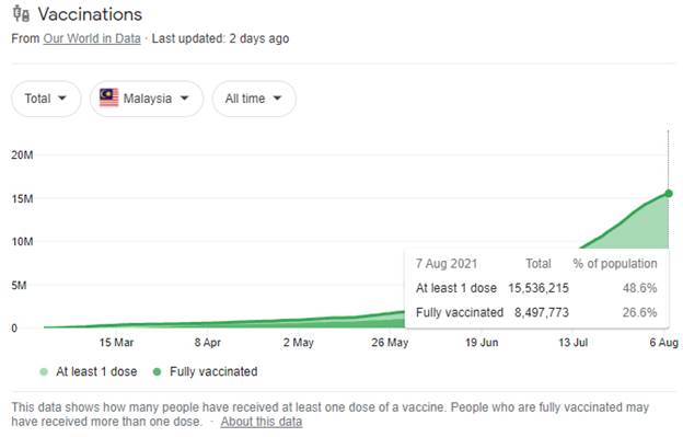 최근에는 일일 신규확진자수가 20,000명을 넘어 쿠알라룸푸르 병원 등 공립병원에서는 주차장을 임시로 개조하여 환자를 수용하는 등 의료시스템의 한계에 봉착하고 있다. 백신은 2월1일 아스트라 제네카를 시작으로 시노백, 화이자 등이 도입되어 접종을 실시하고 있으며 2021년 8월 7일 현재 전국민의 48.6%인 1,553만명이 1차 접종을 완료하였고, 이중 2차 접종까지 완료한 사람은 26.6%인 849만명이다.