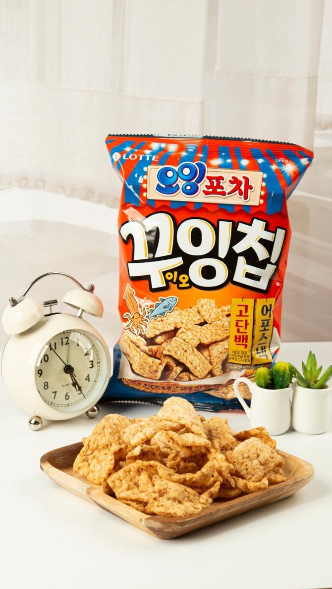 오잉포차 꾸이오잉칩은 단백질 스낵과 어포 스낵의 장점을 두루 모아 만든 새로운 개념의 스낵으로 독특한 식감과 함께 짭조름한 해산물 특유의 감칠맛을 모두 살렸다는 강점이 있다.