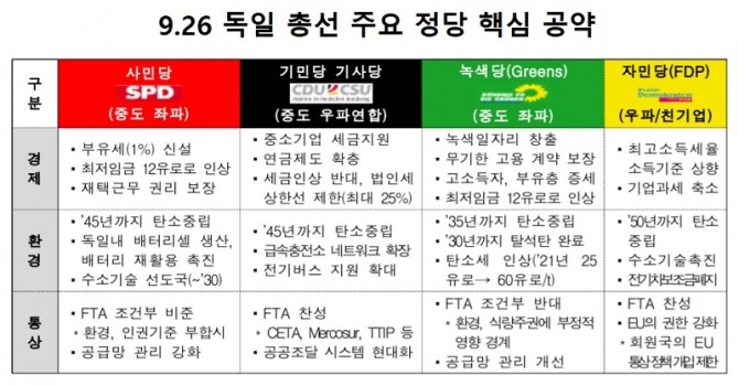 따라서 독일 차기정부가 좌파와 자유주의 계열의 진보 성향 구성으로 이뤄질 가능성이 높다는 점에서 코트라는 신호등 연정 정당의 경제·산업정책 분석을 토대로 녹색당의 환경노선이 차기 연립정부 정책에 큰 영향을 미칠 것으로 전망했다.