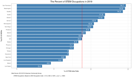 STEM 직종은 미국 각 지역에 따라 그 비중이 매우 다르게 나타나고 있다. 아래 20대 메트로 지역에서 2019년을 기준으로 샌프란시스코, 워싱턴, 시애틀은 STEM 직종이 약 14%로서 풍부한 STEM 노동력이 집중되어 있고, 오스틴, 보스턴 지역이 상대적으로 STEM 직종이 높게 집중된 지역으로 그 뒤를 따르고 있다. 그에 반해 전통적으로 큰 도시가 위치한 뉴욕, 로스앤젤레스, 시카고 등은 STEM 직종 비중이 비교적 낮게 나타나고 있다.