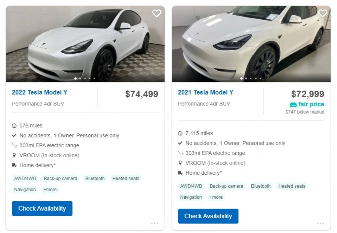 일렉트렉이 미국의 중고차 판매업체들을 대상으로 최근 조사를 벌인 결과에 따르면 먼저 나온 테슬라 모델3과 최근 나온 테슬라 모델Y 모두 중고차 가격이 급등세를 보이고 있는 가운데 미국 일리노이주에서 중고 매물로 나온 주행거리 1만5000마일(약 2만4140km)인 2021년식 모델Y의 판매가격이 8만달러(약 1억117만원)를 웃돈 것으로 확인됐다.