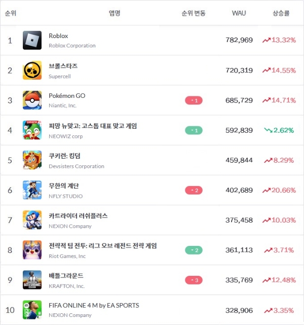 슈퍼셀 '클래시로얄'은 WAU 32만3690명으로 11위에 올랐다. 마이크로소프트 '마인크래프트'와 어썸피스 '좀비고등학교' 등은 28만명 전후의 WAU가 몰려 13위, 14위를 차지했다.