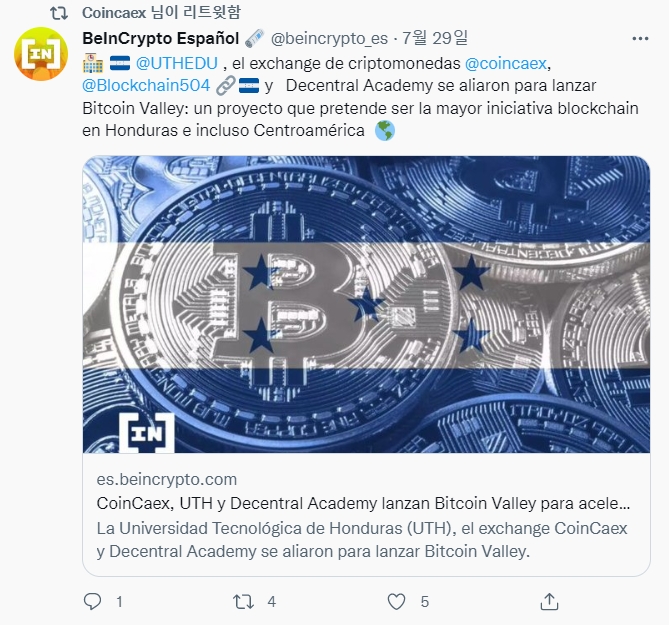 온두라스가 관광 수입을 높이기 위해 '비트코인 밸리'를 시작했다. 사진=트위터이미지 확대보기