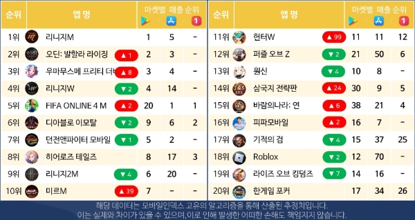 엔씨소프트(NC) '리니지M'이 1위를 지킨 가운데 카카오게임즈의 '오딘: 발할라 라이징'이 '우마무스메'와 더불어 톱3에 자리 잡았다. NC '리니지W'는 4위로 밀려났으며 5위는 넥슨 '피파 온라인 4M'이 차지했다.
