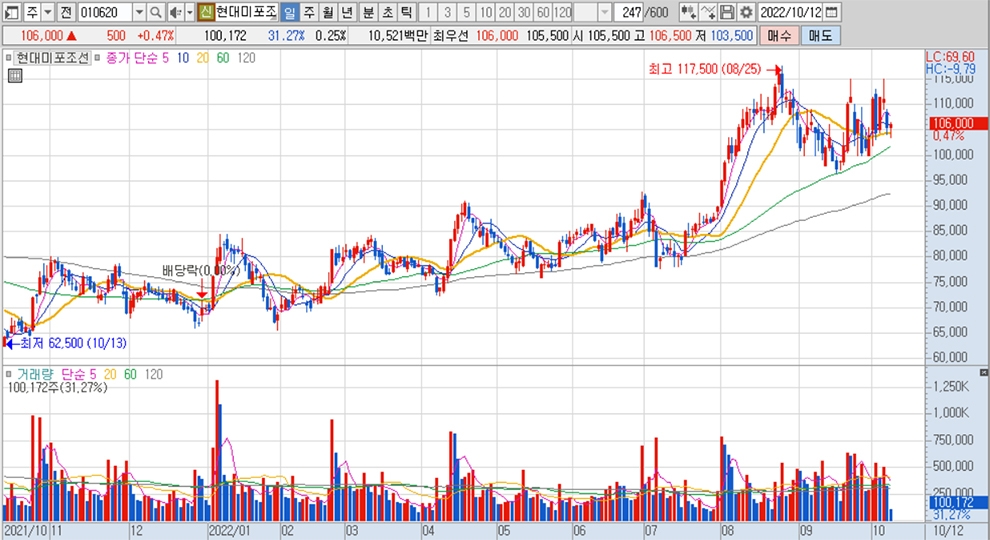 이미지 확대보기현대미포조선의 주가는 12일 오전 10시 10분 현재 전일보다 500원(0.47%) 오른 10만6000원에 거래되고 있습니다.