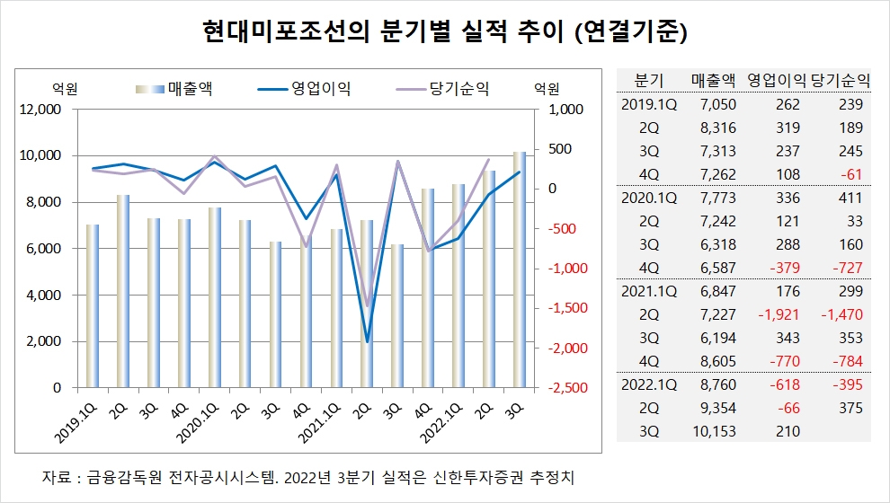 이미지 확대보기신한투자증권은 현대미포조선의 올해 3분기 연결기준 매출액이 1조153억원, 영업이익이 210억원에 이를 것으로 내다보고 있습니다. 3분기 영업이익은 시장 컨센서스인 156억원을 소폭 상회하는 수준입니다.
