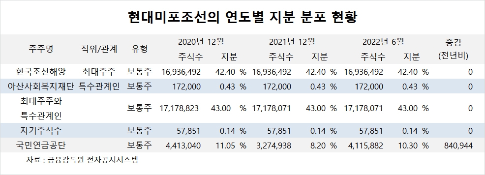 이미지 확대보기현대미포조선의 최대주주는 한국조선해양으로 지분 42.40%를 보유하고 있습니다.