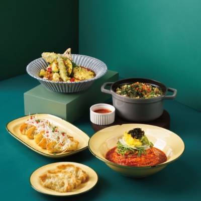 이미지 확대보기프라잉 가지 베지 카레는 카레소스에 튀긴 가지 튀김과 구운 채소를 올린 카레라이스다. 헬시업 가지 덮밥은 귀리율무밥을 구운 가지, 새송이, 소이불고기(식물성대체육), 명이나물을 양념 간장소스에 비벼 먹는 메뉴다. 아삭 채소 비빔국수&교자만두는 삶은 생소면에 채소와 궁채를 특제 고추장소스에 비벼 먹는 비빔국수다. 함께 제공되는 교자만두는 ‘식물성 지구식단’ 표고야채 한식교자다. 교자만두는 표고야채 한식교자에 파채, 쪽파, 파프리카 토핑을 올린 메뉴다.