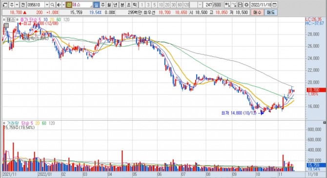 이미지 확대보기테스의 주가는 18일 오전 9시 50분 현재 전일보다 200원(1.08%) 오른 1만8700원에 거래되고 있습니다.