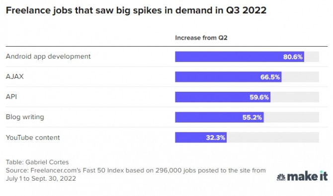 그 결과 지난 2분기와 비교해 가장 눈에 띄게 수요가 증가한 프리랜서 직업은 안드로이드앱 개발자인 것으로 나타났다. 올 3분기 안드로이드앱 개발자를 찾는 공고가 2분기 대비 무려 80.6%나 급증한 것으로 확인됐기 때문이다.