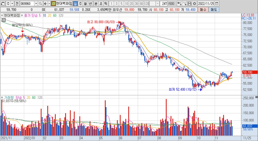 이미지 확대보기현대백화점의 주가는 지난 25일 전일과 같은 5만9700원에 장을 마쳤습니다. 현대백화점의 자사수는 발행주식의 6.61%(154만7255주)에 이릅니다. 자사주의 시가총액은 25일 종가를 기준으로 923억7112만원에 달합니다.