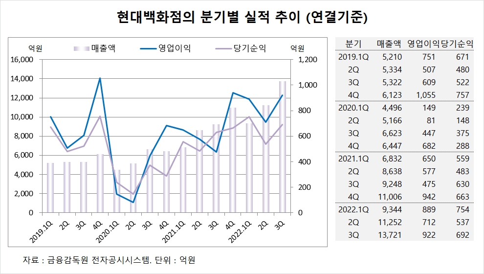 이미지 확대보기현대백화점은 올해 3분기 실적을 집계한 결과 연결기준 매출액이 1조3721억원, 영업이익이 922억원, 당기순이익이 692억원을 기록했다고 공시했습니다.
