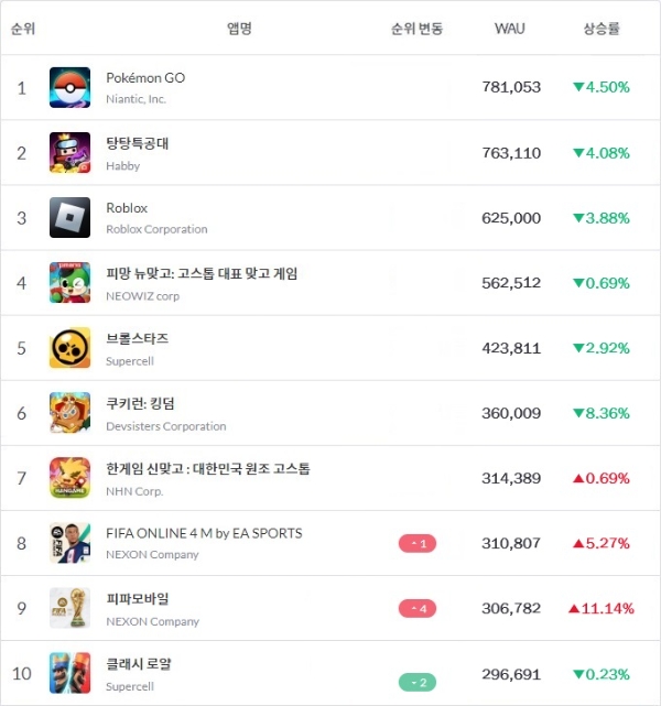 WAU 톱7 게임들의 순위엔 큰 변동이 없던 가운데 넥슨 게임들의 약진으로 슈퍼셀 '클래시 로얄'이 8위에서 10위로, 라이엇 게임즈 '전략적 팀 전투(TFT)'는 슈퍼셀 '클래시 오브 클랜'에 밀려 12위에 자리잡았다.