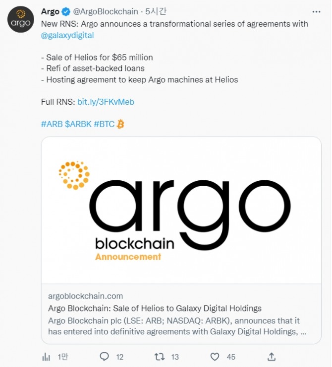 아르고는 이날 성명을 통해 마이크 노보그라츠의 암호화폐 중심 금융 서비스 회사 갤럭시 디지털로부터 3500만 달러(약 444억 원)의 신규 대출도 받을 것이라고 밝혔다.