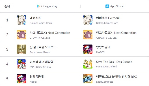 '라그나로크X'의 경우 5일 출시 직후 애플 앱스토어 인기 1위를 차지했으나 현재는 '에버소울'에 자리를 내줬다. 구글 플레이스토어의 경우 5일 3위에서 출발, 6일 오전 9시를 기점으로 2위에 올랐다.
