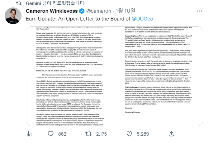 쌍둥이 동생 타일러와 제미니를 공동 창업한 카메론 윙클보스는 최근 제네시스와 모기업인 디지털통화그룹(DCG)에 대한 압박 수위를 높였다. 윙클보스는 지난주 트위터에서 배리 실버트 DCG 최고경영자(CEO)와 논쟁을 펼쳤다. 윙클보스는 최근 트위터에 게시된 두 개의 공개 편지에서 실버트를 "나쁜 믿음 지연 전술"이라고 비난하고 실버트의 회사 CEO직 해임을 요구했다. DCG 대변인은 윙클보스의 편지를 "절망적이고 비건설적인 홍보 스턴트"라고 비난했다