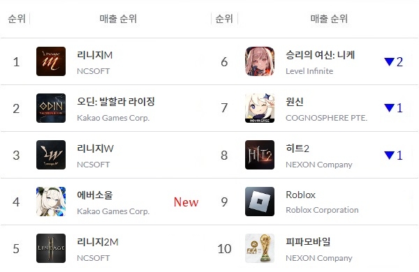 '에버소울' 외 순위 상승에 발맞춰 시프트업 '승리의 여신: 니케', 호요버스 '원신', 넥슨 '히트2' 등의 순위가 소폭 하락했다. 그 외 매출 톱10 게임들은 대체로 제 자리를 지켰다.