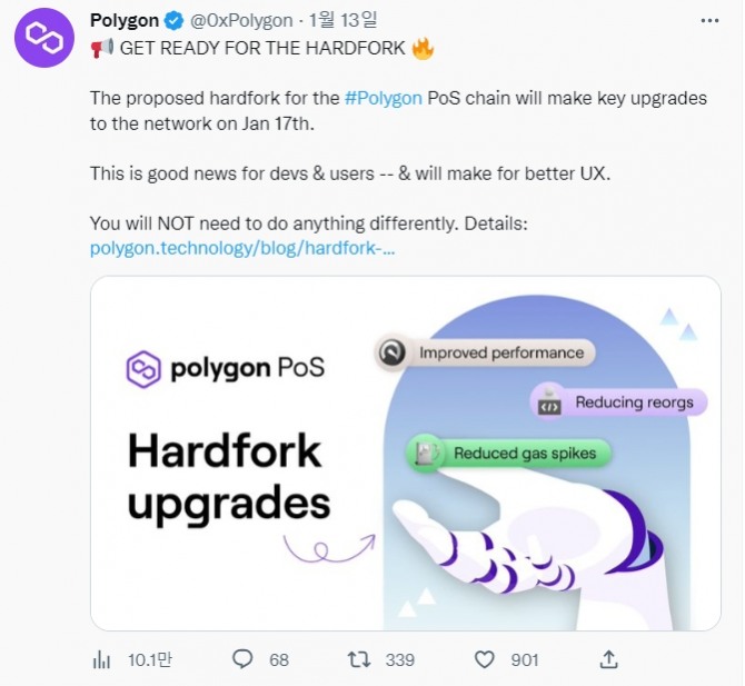 폴리곤 대변인은 또 다음날인 지난 14일 하드포크의 추가 세부 정보를 제공했다.