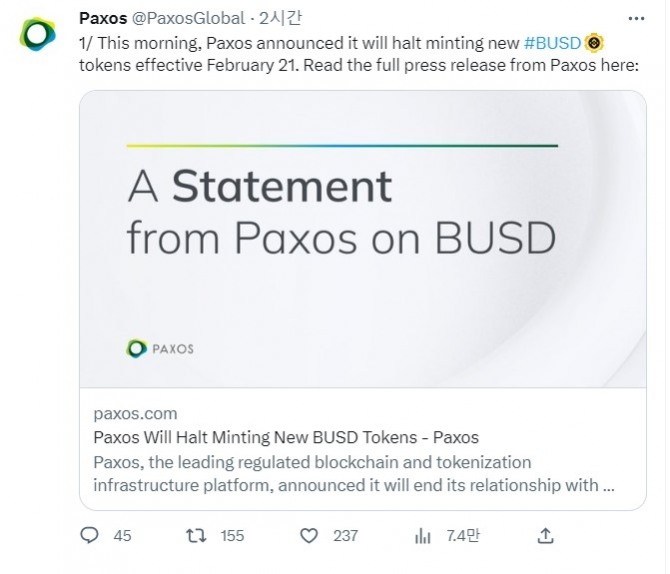 아울러 "2월 21일부터 새로운 #BUSD 토큰의 주조를 중단할 것"이라고 발표했다.