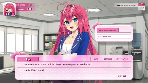 이미지 확대보기MSCHF가 최근 공개한 '택스 헤븐 3000'은 가상의 법인세 신고 서비스 '터보택스'와 이를 위해 이용자를 돕는 분홍 머리 비서 '아이리스'를 주요 콘텐츠로 한다. 아이리스와 대화하며 자신의 재무상황에 대해 되짚는 한편 자신의 선택지에 따라 아이리스의 호감도가 오르내리는 일종의 '비주얼 노블'이다.